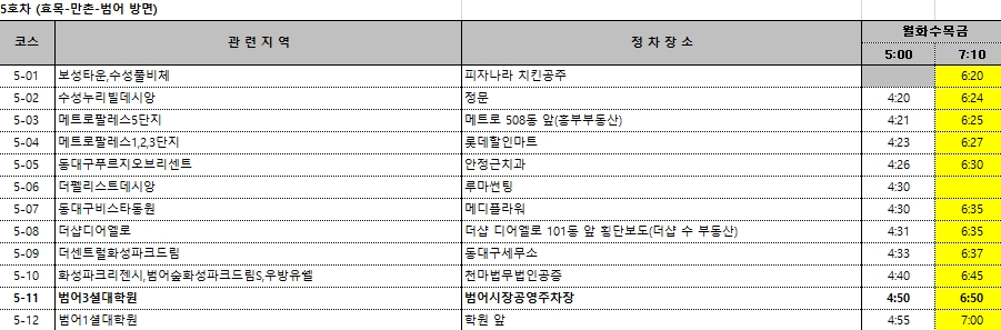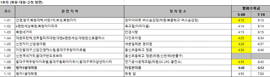 - 1호차 1교시(5시)수업반 탑승시간 당겨짐