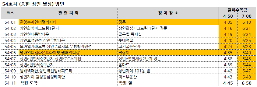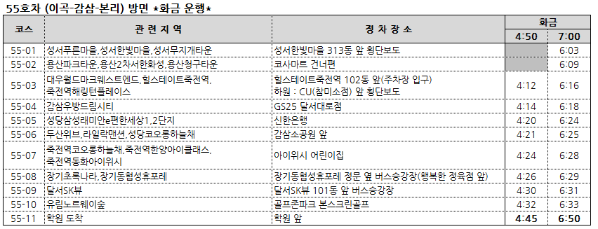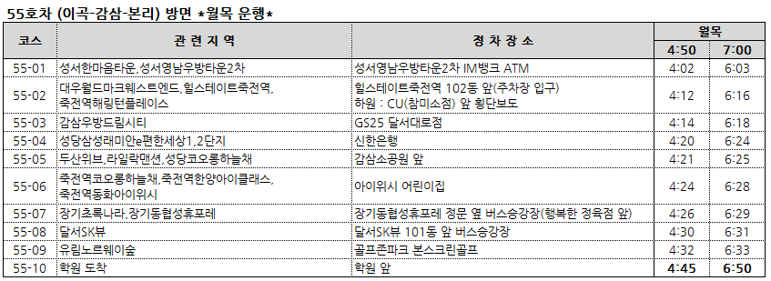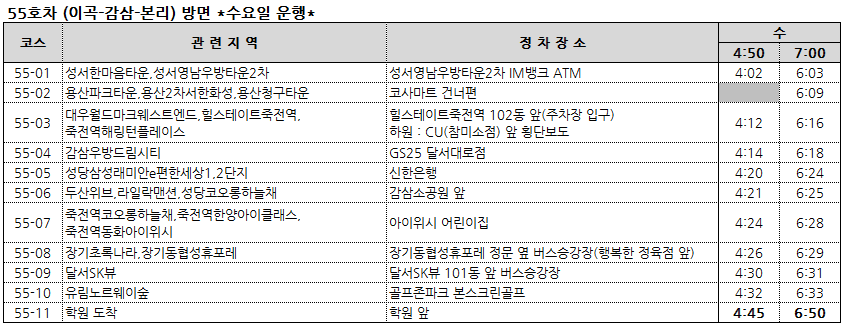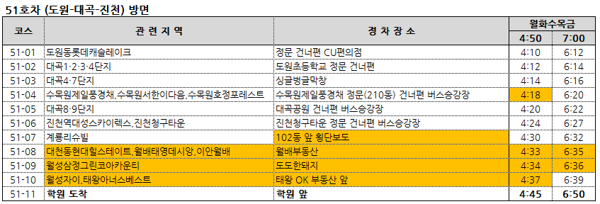 51-04 수목원제일풍경채,수목원서한이다음,수목원호정포레스트 > 1교시 탑승시간변경