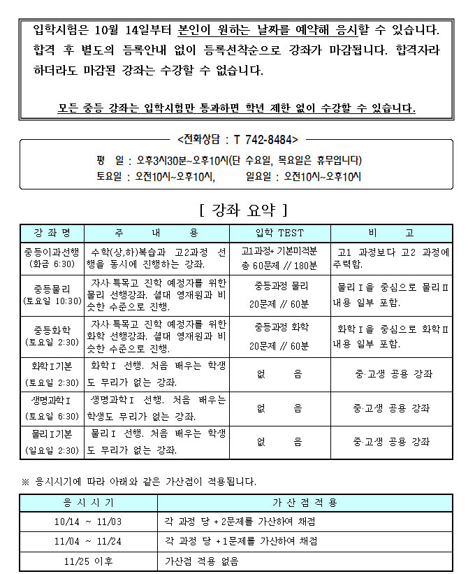 [겨울개강] 고1심화반 개강 안내 (시험일+개강일 수정)